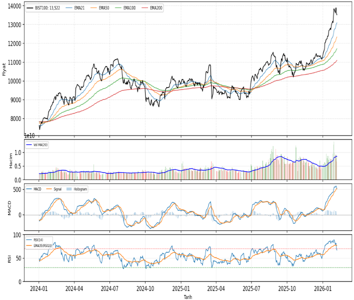 BIST100 haftanın son işlem gününde sınırlı düşük açılışla test ettiği 13403 seviyesinden tepki yaşadı. Kapanış 13522 seviyesinde gerçekleşti. Günlük bazda %-0,49’luk sınırlı geri çekilme yaşanırken, gün içi hareket alanının 225 puan ile nispeten dar kaldığı görülüyor. Bununla birlikte kapanışın gün içi fiyat aralığının üst yarısında (%53) gerçekleşmiş olması satış baskısına rağmen dipten toparlanma refleksinin devrede olduğuna işaret ediyor. Tepki hareketi bu aşamada nispeten katılımsız (hacim düşük). Bu yüzden görüntü belirgin bir “dönüş teyidi” değil, daha çok sindirim / dengeleme karakterinde. Haftalık kapanış tarafında da %-2,29’luk geri çekilme kısa vadeli momentumun hâlâ zayıf/negatif kaldığına işaret ediyor. Teknik görünümde EMA20 (13126) > EMA50 (12339) > EMA200 (11088) sıralaması ana yükseliş trendinin sürdüğünü teyit eder nitelikte. Diğer taraftan, işlem hacmi 20 günlük ortalamanın altında (Vol/Vol20: 0.78) olarak gerçekleşti. Endekste gün içerisinde test edilen 13403 seviyesi kritik destek olarak dikkate alınmalı. 13589–13628 bandı yakın direnç konumunda. Bu bölge üzerine geri dönüş kısa vadede iyimserliğin korunması açısından önemli. 13661–13928 üst direnç bölgesi. Endekste 13403–13267 bandı ise kritik destek konumunda. Bu seviye altında 12858-12528 bölgesi destek olarak izlenebilir.