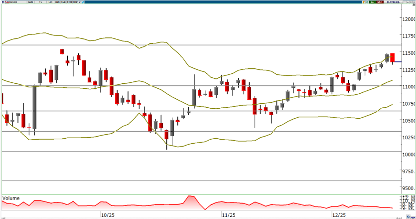 Endeks, dün gerçekleşen işlemlerde 107,51 puan düşüşle 11,348 puan seviyesinden kapanış gerçekleştirdi.