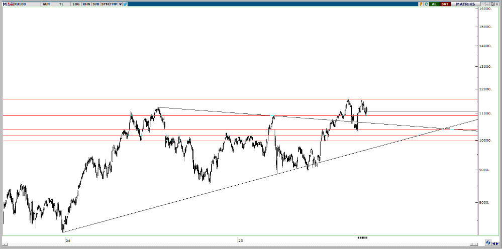 BIST100 Endeksi perşembe gününü %1,23 düşüş ile 11.082 puandan kapattı. Endeks gün içinde 11.051-11.256 bandında hareket etti. Endeksin hacmi ise 135,84mlr TL gerçekleşti. Yukarı yönlü hareketlerde yatay trend direnci olan 11.580 seviyesi takip edilebilir. Aşağı yönlü hareketlerde ilk etapta yatay trend desteği olan 10.895 seviyesi takip edilebilir. Desteğin aşağı yönlü kırılması durumunda alçalan trend desteği olan 10.630 seviyesi izlenebilir. Desteğin aşağı yönlü kırılması durumunda ise yatay trend desteği olan 10.400 seviyesi hedeflenebilir.