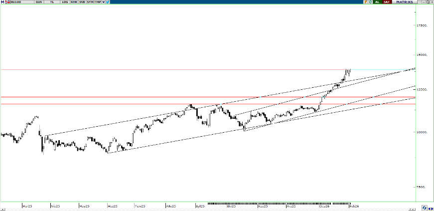 BIST100 Endeksi salı gününü %1,87 yükseliş ile 13.875 puandan kapattı. Endeks gün içinde 13.660-13.926 bandında hareket etti. Endeksin hacmi ise 248,99mlr TL gerçekleşti. Yukarı yönlü hareketlerde yatay direnç olan 13.875 seviyesi izlenebilir. Aşağı yönlü hareketlerde ilk etapta orta vadeli kanalın üst bant desteği olan 13.110 seviyesi takip edilebilir. Desteğin kırılması durumunda kısa vadeli yükselen kanalın üst bant desteği olan 12.835 seviyesi izlenebilir. Desteğin kırılması durumunda yatay destek olan 12.020 seviyesi takip edilebilir.