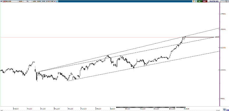 BIST100 Endeksi çarşamba gününü %0,11 yükseliş ile 13.891 puandan kapattı. Endeks gün içinde 13.834-13.998 bandında hareket etti. Endeksin hacmi ise 201,33mlr TL gerçekleşti. Yukarı yönlü hareketlerde yükselen trend direnci olan 14.000 seviyesi izlenebilir. Aşağı yönlü hareketlerde ilk etapta yatay destek olan 13.875 seviyesi takip edilebilir. Desteğin Kırılması durumunda orta vadeli kanalın üst bant desteği olan 13.125 seviyesi takip edilebilir.