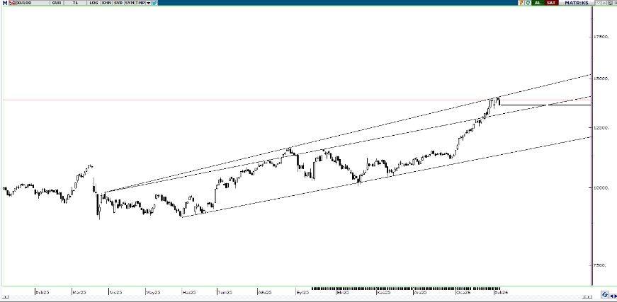 BIST100 Endeksi perşembe gününü %2.17 düşüş ile 13.589 puandan kapattı. Endeks gün içinde 13.589-13.977 bandında hareket etti. Endeksin hacmi ise 192,27mlr TL gerçekleşti. Yukarı yönlü hareketlerde ilk etapta yatay direnç olan 13.875 seviyesi takip edilebilir. Direncin kırılması durumunda yükselen trend direnci olan 14.050 seviyesi izlenebilir. Aşağı yönlü hareketlerde orta vadeli kanalın üst bant desteği olan 13.145 seviyesi takip edilebilir.
