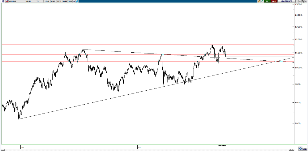 BIST100 Endeksi pazartesi gününü %1,14 düşüş ile 10.734 puandan kapattı. Endeks gün içinde 10.706-10.928 bandında hareket etti. Endeksin hacmi ise 117,73mlr TL gerçekleşti. Yukarı yönlü hareketlerde ilk etapta yatay trend direnci olan 10.895 seviyesi izlenebilir. Direncin yukarı yönlü kırılması durumunda yatay trend direnci olan 11.580 seviyesi takip edilebilir. Aşağı yönlü hareketlerde ilk etapta alçalan trend desteği olan 10.630 seviyesi izlenebilir. Desteğin aşağı yönlü kırılması durumunda yatay trend desteği olan 10.400 seviyesi hedeflenebilir. Yatay trend desteğinin aşağı yönlü kırılması durumunda ise yatay trend desteği olan 10.165 seviyesi takip edilebilir.