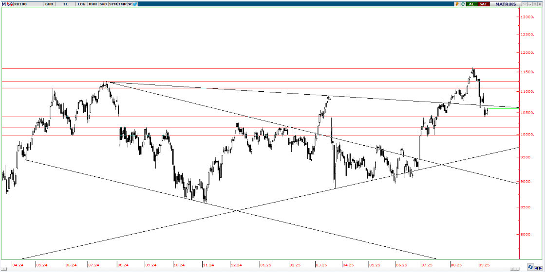 BIST100 Endeksi çarşamba gününü %0,96 yükseliş ile 10.586 puandan kapattı. Endeks gün içinde 10.445-10.586 bandında hareket etti. Endeksin hacmi ise 110,26mlr TL gerçekleşti. Yukarı yönlü hareketlerde ilk etapta alçalan trend direnci olan 10.655 seviyesi izlenebilir. Direncin yukarı yönlü kırılması durumunda yatay trend direnci olan 11.090 seviyesi takip edilebilir. Direncin yukarı yönlü kırılması durumunda yatay trend direnci olan 11.255 seviyesi izlenebilir. Aşağı yönlü hareketlerde ilk etapta yatay trend desteği olan 10.400 seviyesi izlenebilir. Desteğin aşağı yönlü kırılması durumunda ise yatay trend desteği olan 10.165 seviyesi hedeflenebilir. Yatay trend desteğinin aşağı yönlü kırılması durumunda ise yatay trend desteği olan 9.985 seviyesi takip edilebilir.