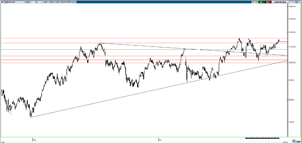 BIST100 Endeksi salı gününü %0,94 düşüş ile 11.348 puandan kapattı. Endeks gün içinde 11.308-11.470 bandında hareket etti. Endeksin hacmi ise 122,47mlr TL gerçekleşti. Yukarı yönlü hareketlerde yatay direnç olan 11.580 seviyesi hedeflenebilir. Aşağı yönlü hareketlerde ilk etapta yatay destek olan 11.255 seviyesi izlenebilir. Desteğin kırılması durumunda yatay destek olan 10.810 seviyesi takip edilebilir. Hareketin devamı durumunda ise 10.470 seviyesi hedeflenebilir.