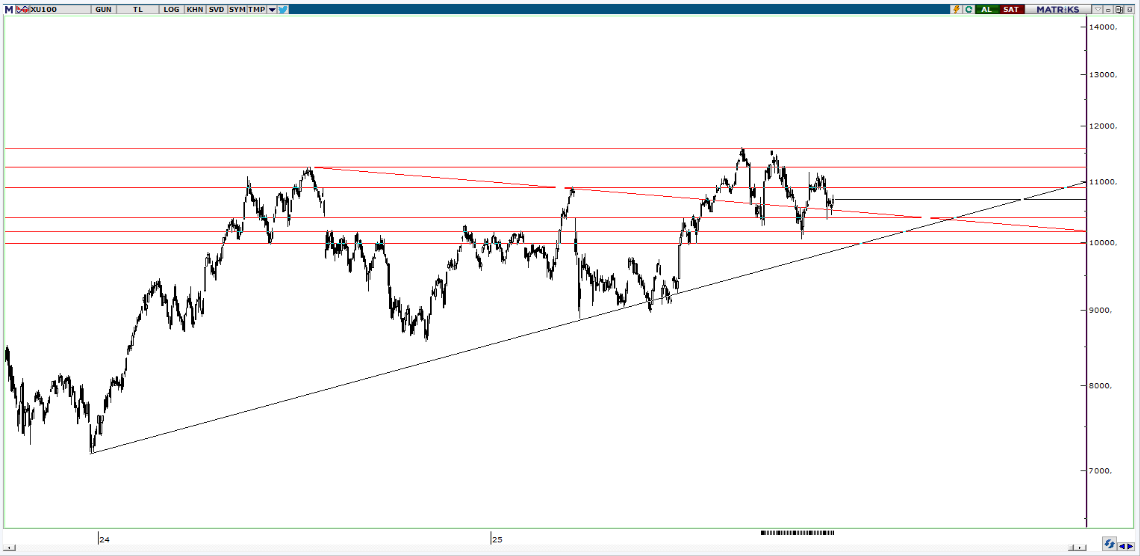 BIST100 Endeksi pazartesi gününü %1,25 yükseliş ile 10.698 puandan kapattı. Endeks gün içinde 10.585-10.774 bandında hareket etti. Endeksin hacmi ise 138,29mlr TL gerçekleşti. Yukarı yönlü hareketlerde ilk etapta yatay direnç olan 10.895 seviyesi izlenebilir. Direncin aşılması durumunda yatay direnç olan 11.255 seviyesi takip edilebilir. Hareketin devamı durumunda ise 11.580 seviyesi hedeflenebilir. Aşağı yönlü hareketlerde ilk etapta alçalan trendin desteği olan 10.515 seviyesi takip edilebilir. Desteğin kırılması durumunda yatay destek olan 10.400 seviyesi takip edilebilir. Desteğin aşılması durumunda yatay destek olan 10.165 seviyesi izlenebilir.