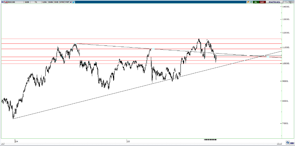 BIST100 Endeksi pazartesi gününü %2,70 yükseliş ile 10.484 puandan kapattı. Endeks gün içinde 10.109-10.522 bandında hareket etti. Endeksin hacmi ise 146,52mlr TL gerçekleşti. Yukarı yönlü hareketlerde ilk etapta alçalan trend direnci olan 10.610 seviyesi hedeflenebilir. Direncin yukarı yönlü kırılması durumunda yatay trend direnci olan 10.895 seviyesi izlenebilir. Yatay trend direncinin yukarı yönlü kırılması durumunda ise yatay trend direnci olan 11.255 seviyesi takip edilebilir. Aşağı yönlü hareketlerde ilk etapta yatay trend desteği olan 10.400 seviyesi izlenebilir. Desteğin aşağı yönlü kırılması durumunda yatay trend desteği olan 10.165 seviyesi takip edilebilir. Desteğin aşağı yönlü kırılması durumunda ise yatay trend desteği olan 9.985 seviyesi hedeflenebilir.