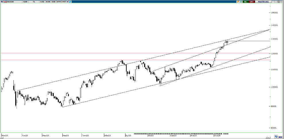 BIST100 Endeksi perşembe gününü %0,97 yükseliş ile 12.851 puandan kapattı. Endeks gün içinde 12.682-12.861 bandında hareket etti. Endeksin hacmi ise 219,84mlr TL gerçekleşti. Yukarı yönlü hareketlerde yükselen kanalın direnci olan 12.970 seviyesi takip edilebilir. Aşağı yönlü hareketlerde ilk etapta kısa vadeli yükselen kanalın üst bant desteği olan 12.635 seviyesi izlenebilir. Desteğin kırılması durumunda yatay destek olan 12.020 seviyesi takip edilebilir. Hareketin devamı durumunda ise 11.580 seviyesi hedeflenebilir.