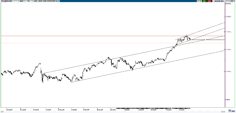 BIST100 Endeksi çarşamba gününü %1,71 düşüş ile 13.809 puandan kapattı. Endeks gün içinde 13.752-14.068 bandında hareket etti. Endeksin hacmi ise 175,64mlr TL gerçekleşti. Yukarı yönlü hareketlerde ilk etapta yatay direnç olan 14.360 seviyesi takip edilebilir. Direncin kırılması durumunda ise kısa vadeli yükselen kanalın direnci olan 14.590 seviyesi hedeflenebilir. Aşağı yönlü hareketlerde ilk etapta kısa vadeli yükselen kanalın desteği olan 13.780 seviyesi takip edilebilir. Desteğin kırılması durumunda yükselen kanalın üst bant desteği olan 13.395 seviyesi hedeflenebilir. Hareketin devamı durumunda ise yatay destek olan 13.380 seviyesi izlenebilir.