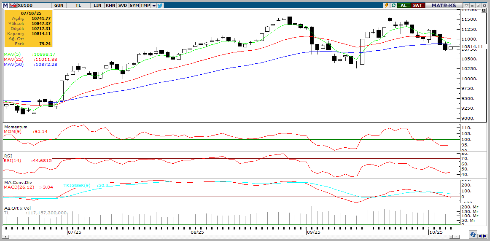 RSI (trendin gücünü gösterir): RSI 44 seviyesine gelerek alım iştahının zayıfladığını gösteriyor. Baskı artabilir. İzlenmeli.