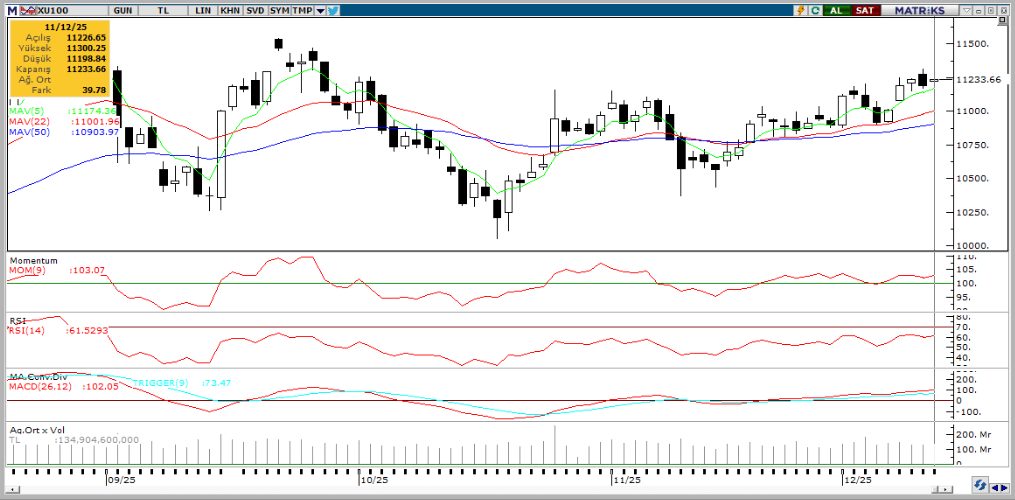 Günaydın. Küresel risk iştahı bu sabah kısmen olumlu bir görünüm sergiliyor; ABD vadelileri karışık, Avrupa vadelileri ve Asya borsaları ise pozitif bölgede. Fed’den faiz indirimi ve tahvil alımlarına dair mesajlar piyasaları desteklerken ABD, Avrupa ve Çin ekonomilerine dair büyüme beklentilerinin yukarı revize edilmesi de 2026’ya yaklaşırken iyimserliği destekliyor. Borsa İstanbul’da dün PPK’dan 150 baz puanlık faiz indirimi sonrasında volatil bir seyir yaşanmakla beraber XU100 endeksi günü %0,4 yükselişle yeniden 11.200 üzerinde tamamladı. Endekse en fazla pozitif katkı sağlayan ilk beş şirket BIMAS, TRALT, FROTO, AKBNK, ASTOR oldu. Son bir haftada düzenli para girişi ile dikkat çeken şirketler ise AKBNK, MPARK, ASELS, PGSUS ve TCELL. Teknik açıdan 11.300 / 11.320 ve 11.500 / 11.600 dirençleri ile 11.150, 11.070 ve 10.900 / 11.000 destekleri izlenebilir. Günün ajandasında, içeride cari denge ve TCMB Piyasa Katılımcıları Anketi ile ilk toplantısı gerçekleşecek olan Asgari Ücret Tespit Komisyonu’nda çıkacak mesajlar izlenecektir. Avrupa ve ABD’de makro takvim sakin, Fed yöneticilerinden bazılarının bugün çeşitli etkinliklerde konuşmaları var, buralarda verilecek mesajlar takip edilecek. Türkiye beş yıl vadeli CDS primleri güne 220 baz puandan başlıyor. Burada bir süredir kademeli bir gevşeme vardı, ancak dün 6 baz puanlık belirgin bir gevşeme olduğunu, bu durumun da XBANK Bankacılık endeksi açısından PPK’dan faiz indirimlerine ek olarak ayrı bir destek unsuru olduğunu belirtelim. Tacirler Yatırım Model Portföy’ünde GARAN ve ISCTR tercih ettiğimizi hatırlatalım. Model Portföy’deki diğer şirketler ise MGROS, THYAO, TUPRS, CCOLA, TKNSA, MAVI, FROTO, TAVHL ve TCELL.