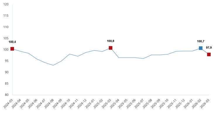 Ekonomik güven endeksi Şubat ayında 100,7 iken, Mart ayında %2,8 oranında azalarak 97,9 değerini aldı.
