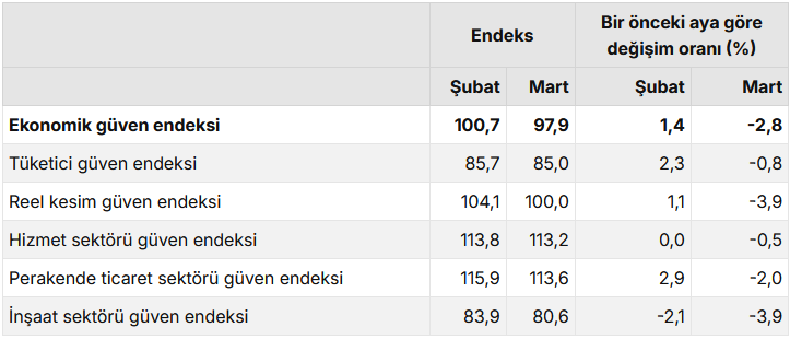 Bir önceki aya göre Mart ayında tüketici güven endeksi %0,8 oranında azalarak 85,0 değerini, reel kesim (imalat sanayi) güven endeksi %3,9 oranında azalarak 100,0 değerini, hizmet sektörü güven endeksi %0,5 oranında azalarak 113,2 değerini, perakende ticaret sektörü güven endeksi %2,0 oranında azalarak 113,6 değerini, inşaat sektörü güven endeksi %3,9 oranında azalarak 80,6 değerini aldı.