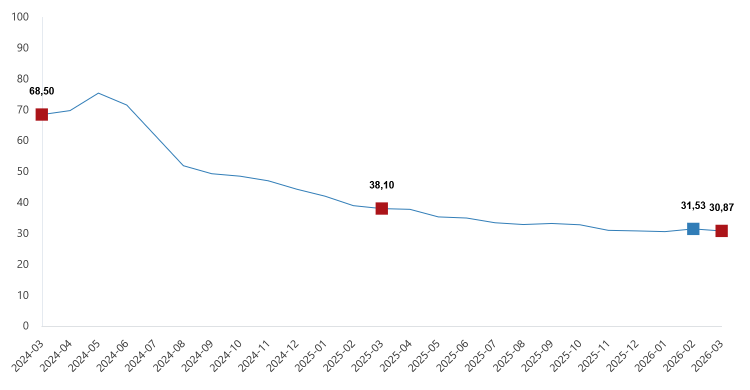 2026 yılı Mart ayı verileri, önceki yılların aynı dönemine göre yıllık enflasyonda belirgin bir yavaşlamaya işaret ediyor. 2024 yılının Mart ayında %68,50 olan yıllık enflasyon, 2025’te %38,10’a, 2026 yılında ise %30,87’ye geriledi.