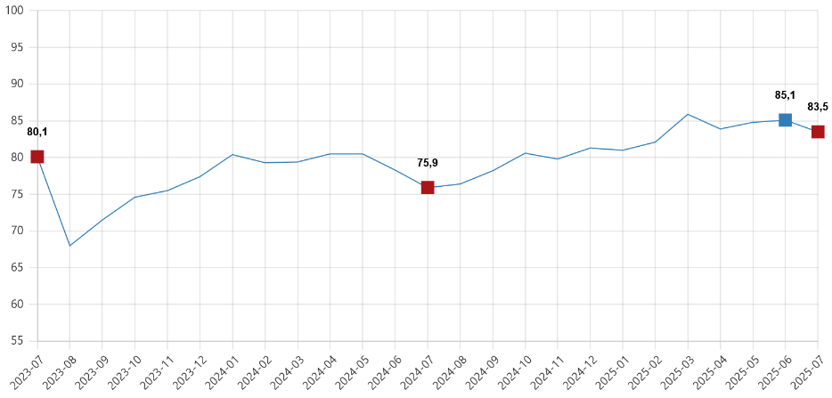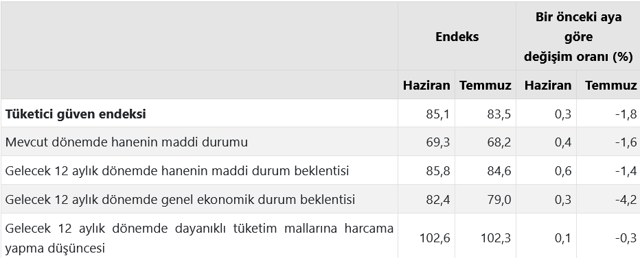 Türkiye İstatistik Kurumu ve Türkiye Cumhuriyet Merkez Bankası işbirliği ile yürütülen tüketici eğilim anketi sonuçlarından hesaplanan tüketici güven endeksi, Haziran ayında 85,1 iken Temmuz ayında %1,8 oranında azalarak 83,5 oldu.