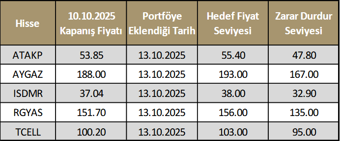 13 Ekim -17 Ekim haftasında geçerli model portföyümüzde ise ATAKP, AYGAZ, ISDMR, RGYAS ve TCELL hisselerine yer veriyoruz.