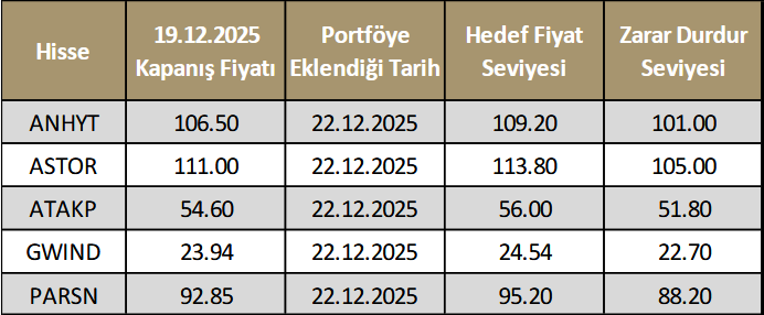 22 Aralık – 26 Aralık haftasında geçerli model portföyümüzde ise ANHYT, ASTOR, ATAKP, GWIND ve PARSN hisselerine yer veriyoruz.